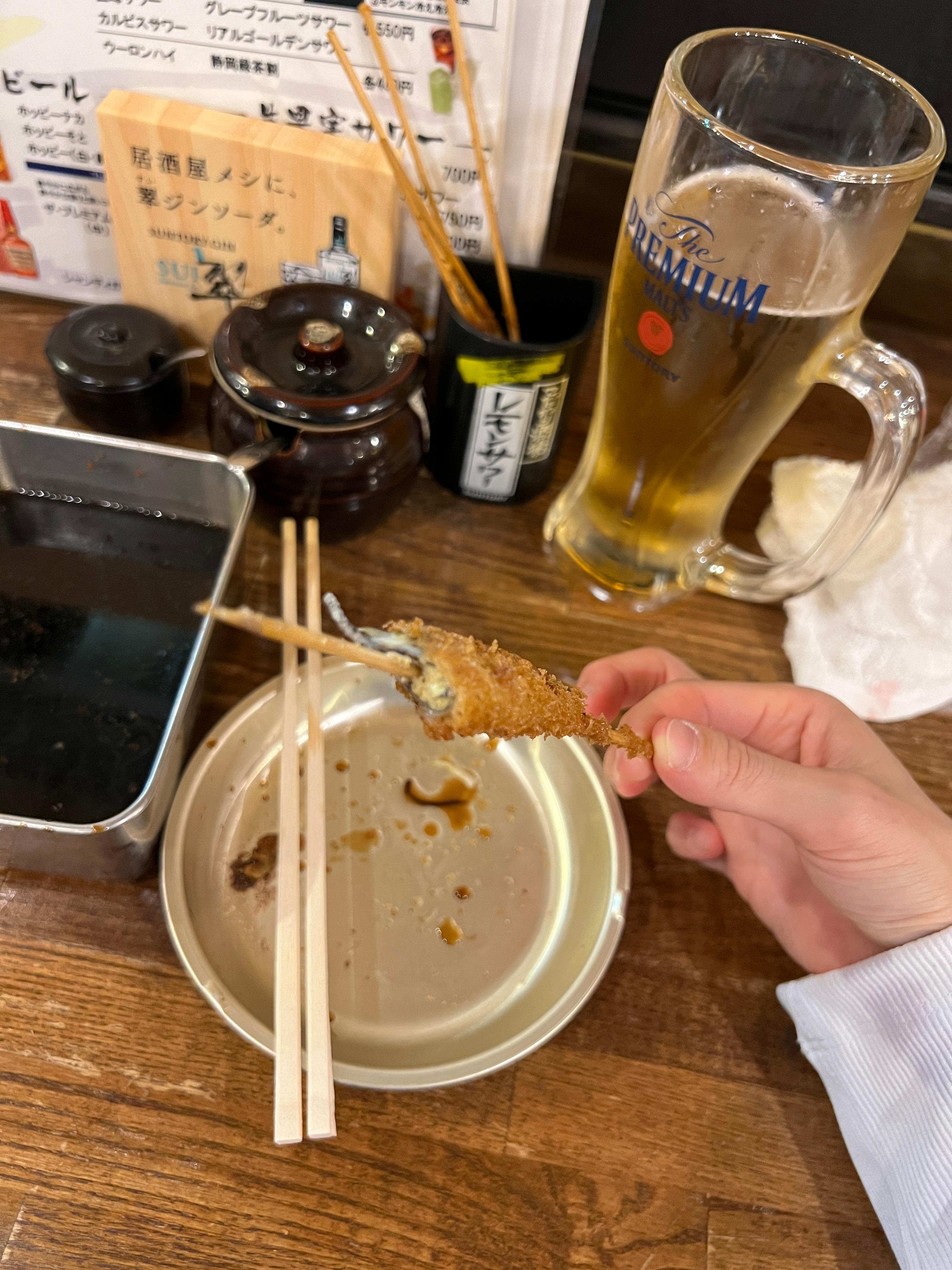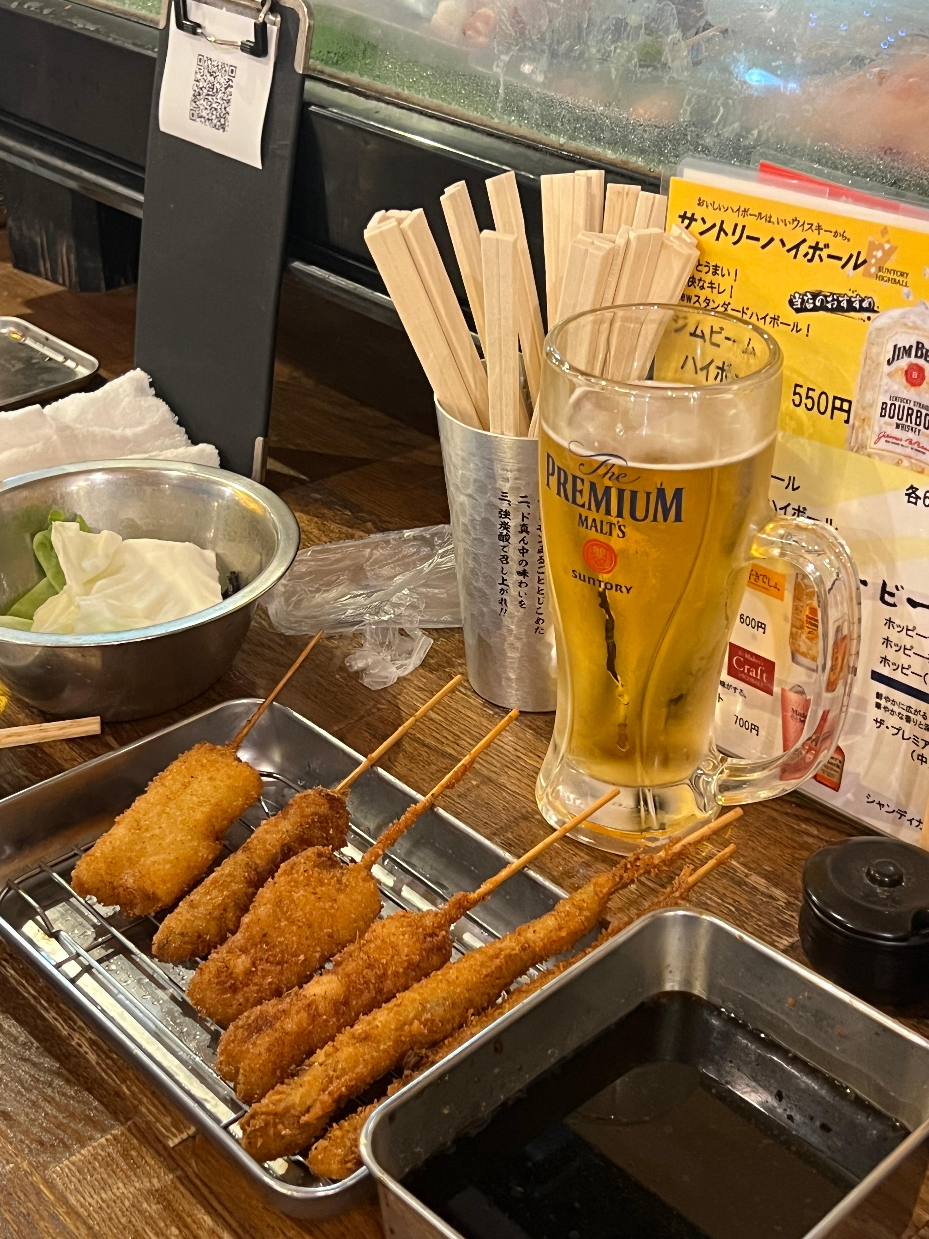 야키토리집이 풀방이라, 차선으로 튀김 꼬치집을 가게된것-!